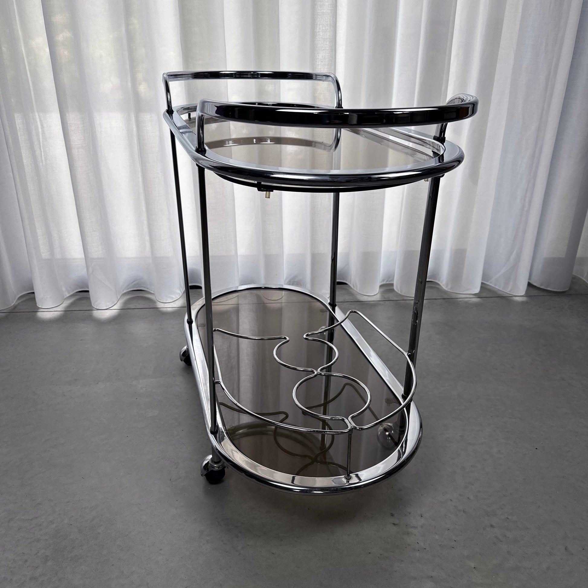 Elegant two-tier bar cart in chrome and smoked glass, with bottle holder on the lower tier. On wheels.