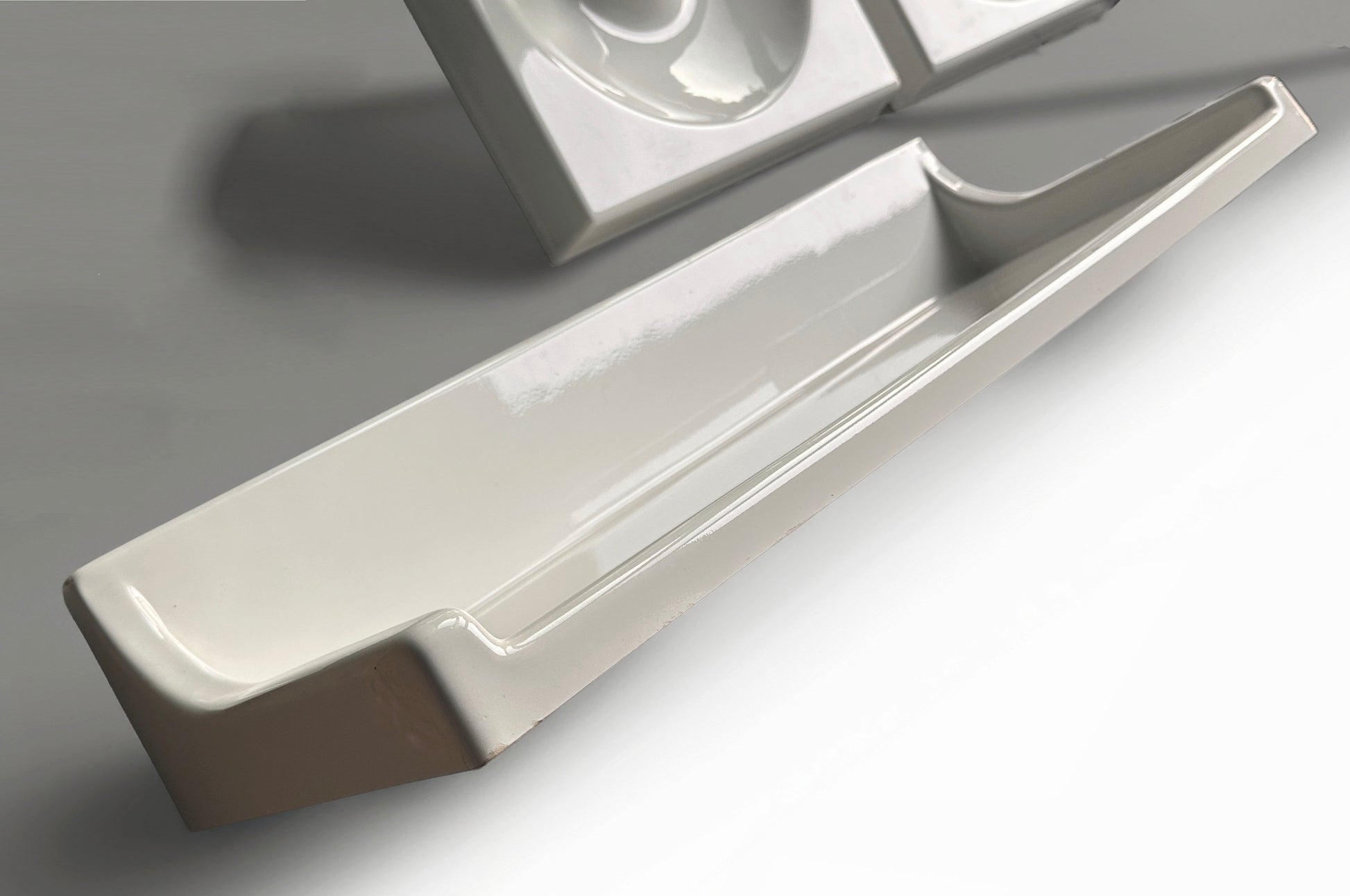 All elements are made from high-gloss white solid plastic. The system is designed to be wall-mounted and can be arranged in multiple configurations to suit your space.