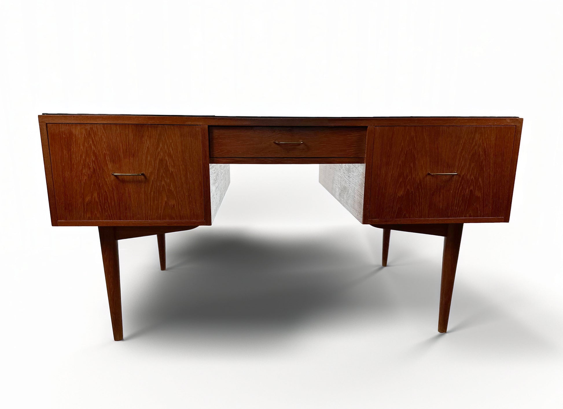 This large vintage mid-century modern desk features a rich teak veneer that highlights its timeless design. It offers a spacious work surface protected by a durable black leatherette cover, providing both functionality and style. Three practical drawers provide ample storage (they are the full depth of the desk), keeping your workspace organized without compromising the desk’s elegant aesthetic. Ideal for those who appreciate classic craftsmanship paired with modern usability.