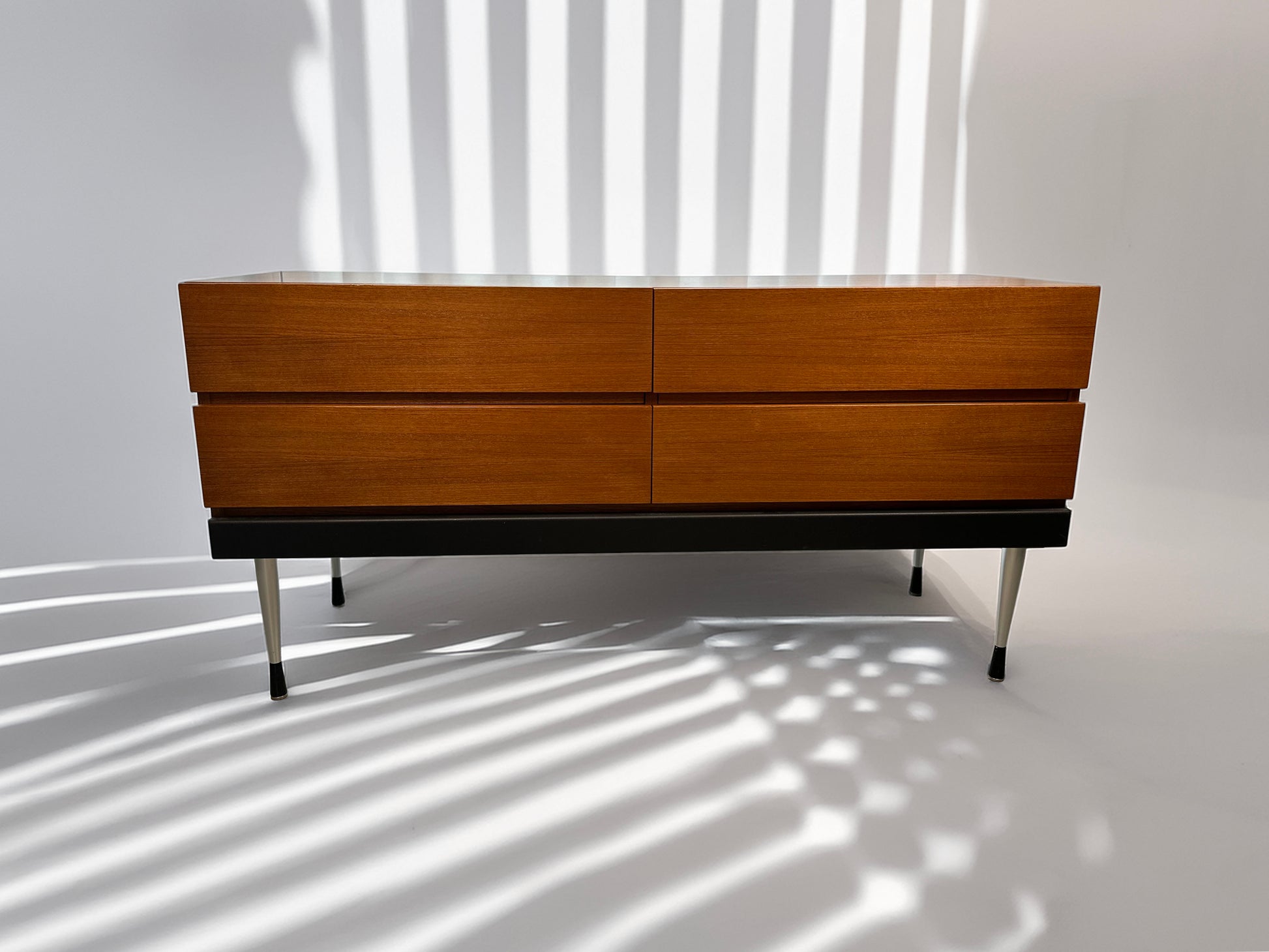 Features 4 spacious drawers, warm wood finish, black plinth with tapered metal legs